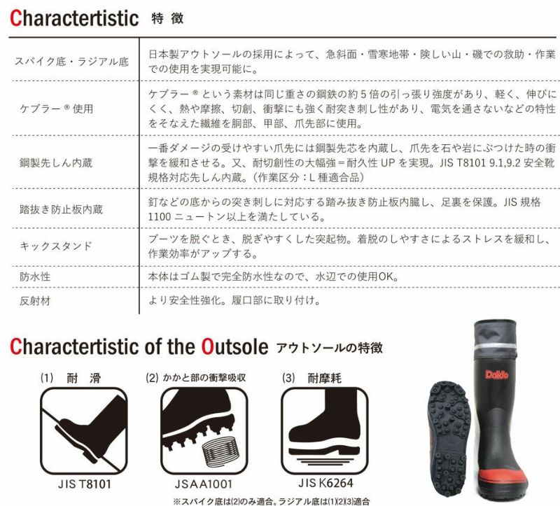 ・鋼鉄製先芯・踏み抜き防止板入り ・多重構造設計で、耐切創・高強力繊維「ケブラー」を胴回りに使用! ・つま先には「鋼鉄製先芯」、中底には「踏抜き防止板」を搭載。 ・耐滑ソールを採用しているので滑りにくい! ・履き口部に反射テープ付き。 ・すべて職人手作りの日本製・完全国内生産