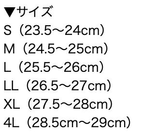S(23.5~24cm) M(24.5~25cm) L(25.5~26cm) LL(26.5~27cm) XL(27.5~28cm) 4L(28.5cm~29cm) ・29cmの場合の履き口の太さは約43cm (内側の太さ↑)