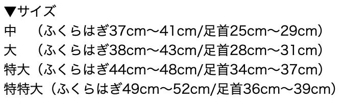 中(ふくらはぎ37cm~41cm/足首25cm~29cm) 大(ふくらはぎ38cm~43cm/足首28cm~31cm) 特大(ふくらはぎ44cm~48cm/足首34cm~37cm) 特特大(ふくらはぎ49cm~52cm/足首36cm~39cm)