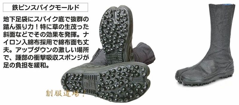 ・ソールは昔ながらの金属スパイク底です! ・丈夫なナイロン入り綿布なので耐久性がアップ。 ・衝撃吸収材が入ってるので疲れにくい。 ・ゴムでコーティングし補強。 ・くるぶし下耐水加工。 (▲耐水加工とは多少の水に濡れにくくなっているだけで完全防水ではないです。) ・全国の森林組合に採用実績多数ございます!