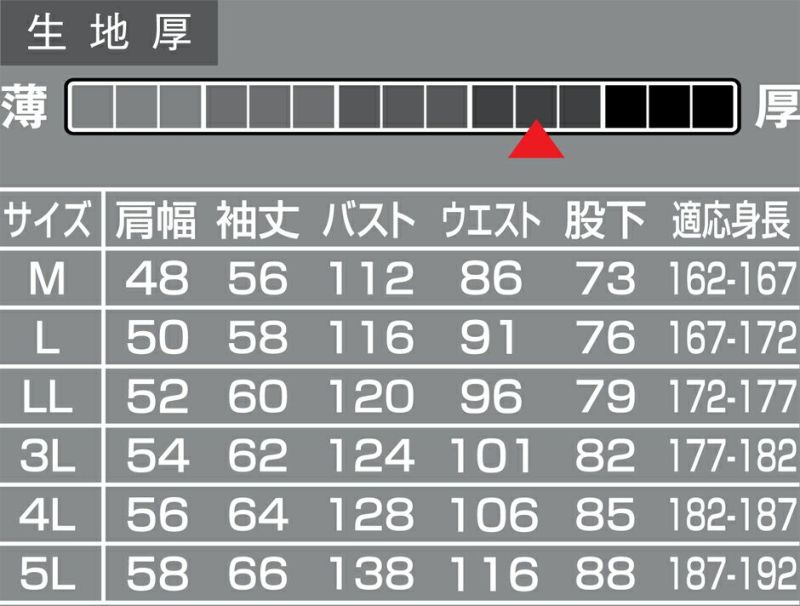 ・YKKファスナー使用 ・袖口(カフス)、胸ポケットフラップ、帯持出し/マジックテープ ・フロントファスナー/コイル(スライダー:金属) ・胸ポケットファスナー/コイル(スライダー:金属) ・腰帯脇ゴム仕様、ジャバラ部パワーネット仕様 ・背中ノーフォーク仕様、右胸ポケット携帯電話ポケット付き ・ペン差し/左袖、左胸ポケットフラップ ・パンツ部/1タック ・前立て、胸ポケットフラップ/ドットボタン(金属)